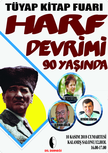 Derneğimizin düzenlediği “Harf Devrimi 90 Yaşında” başlıklı söyleşi 10 Kasım Cumartesi günü saat 16.00-17.00 arası Kalamış Salonunda. Dil Derneği Başkanı Yazar Sevgi Özel’in yöneteceği söyleşiye İlhan Gülek ve Ertuğrul Özüaydın konuşmacı olarak katılacak.