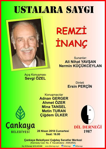 28 Nisan Cumartesi günü Çankaya Belediyesi Çağdaş Sanatlar Merkezinde gerçekleşen, Ali Nihat Yavşan ve Nermin Küçükceylan’ın sunduğu etkinlikte görseller eşliğinde Remzi İnanç’ın yaşamından kesitler sunulurken; arkadaşları, salonu dolduran Remzi İnanç dostlarıyla anılarını paylaştı.