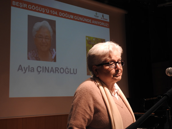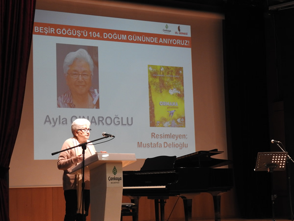 Ödülü alırken yaptığı konuşmada, “Yazdıklarımı bugün ötelenen, değeri bilinmeyen konular üzerine seçiyorum; örneğin orman, doğa, hayvanlar… Bazı değerleri özellikle çocuklarımıza anımsatmaya, aynı zamanda öğretmenlere de benimsetmeye çalışıyorum. Beşir Göğüş bizim için Türkçeyi ilk öğrendiğimiz kişidir, öğretmenimizdir. Aydınlık bir kişidir. Bugün onun adına verilen bu ödülü aldığım için çok mutluyum.” diyen Ayla Çınaroğlu, dernek için bir şeyler yapmak adına Ormana Güzelleme kitabının telifini Dil Derneği’ne devrettiğini açıkladı.