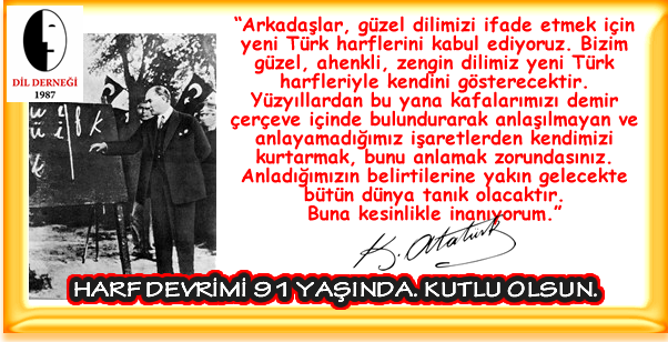 Biz, Atatürk’ün kurduğu 96 yaşındaki laik cumhuriyetimize olduğu gibi Atatürkçü düşünceye, Atatürk’ün başlattığı Harf ve Dil Devrimleriyle ivme kazanan Türk Devrimine de sonsuza dek sahip çıkacak, koşullar ne olursa olsun Türk Devrimini savunacağız!Bu duygularla Harf Devriminin 91. yılını kutluyoruz!