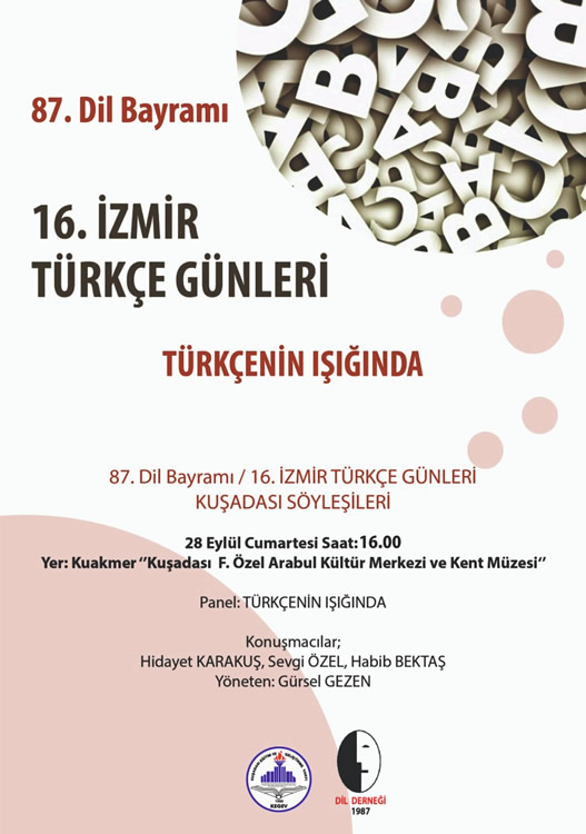 28 Eylül günü ise Kuşadası (Kegev-Kuakmer) F.Özer Arabul Kültür Merkezinde öğrenci, öğretmen, Kuşadası halkının katılımıyla “Türkçenin Işığında” söyleşisi gerçekleştirildi. Özel Ü. Naci Akdoğan Koleji öğrencilerinin seslenişleriyle başlayan etkinlik, Dil Derneği İzmir Temsilcisi Gürsel Gezen’in yönettiği Hidayet Karakuş, Habib Bektaş, Sevgi Özel’in konuşmacı olarak katıldığı söyleşi ile sürdü.