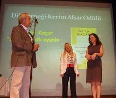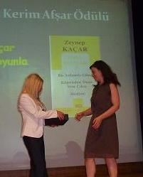 | Ödül töreninde, Zeynep Kaçar'a ödülünü seçici kurul üyeleri Leyla Afşar ile Ahmet Levendoğlu birlikte verdiler. Zeynep Kaçar’ın çok duygulanması, gözyaşlarını tutamaması, bütün konukları etkiledi. Kaçar çok kısa konuşarak, oyunu yazdıran Medine’ye de teşekkür etti. |
