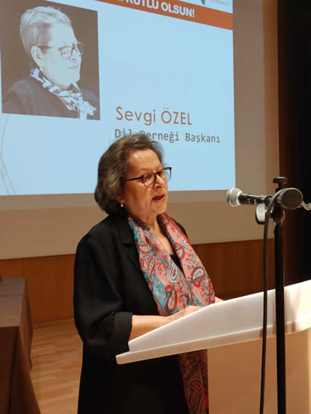 Açış konuşmasını yapmak üzere kürsüye gelen Dil Derneği Başkanı Sevgi Özel konuşmasına cumhuriyetin 100. yılında laik cumhuriyetin kurucusu Mustafa Kemal Atatürk’ü ve Kurtuluş Savaşını utkuyla sonlandıran Kuvayımilliyecileri; Lozan’da bağımsızlığımızı dünyaya kabul ettiren İsmet İnönü’yü saygıyla anarak başladı. Karşıdevrimin kadınları, çocukları, gençleri kullanarak laik cumhuriyetle savaşımını savaşa döndürdüğünü belirten Özel günümüzde her alanı yokluklar ve yoksunlukların kuşattığını anlattı.