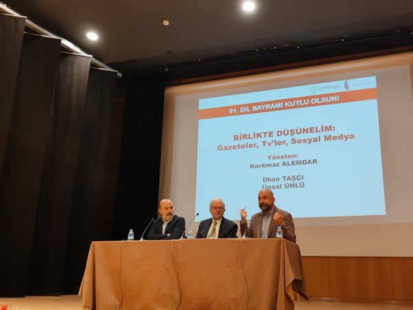 Söyleşiyi yöneten Prof. Dr. Korkmaz Alemdar, konuşmacılar ise RTÜK Üyesi, Gazeteci Yazar İlhan Taşçı ve Gazeteci Ünsal Ünlü idi.