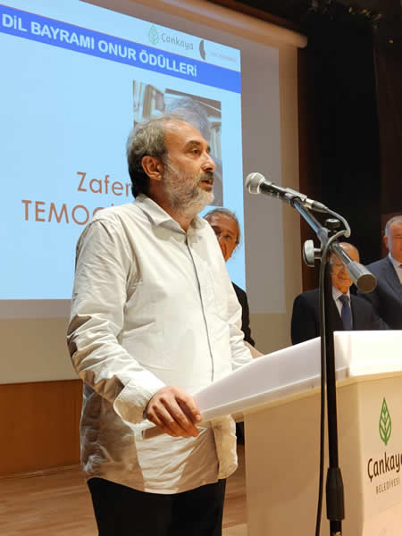 Zafer Temoçin “Biz karikatürcüler çizdiğimizle varız. Bizim dilimiz çizgidir. Dil Derneğinin bir başka dilde var olan bana ödül vermesi garip gelebilir ama ortak dilimiz eşitlik, adalet ve barış dilidir. Dünyanın neresine gidersek gidelim bu dille birbirimize yakınlaşırız,” şeklinde konuştu.
