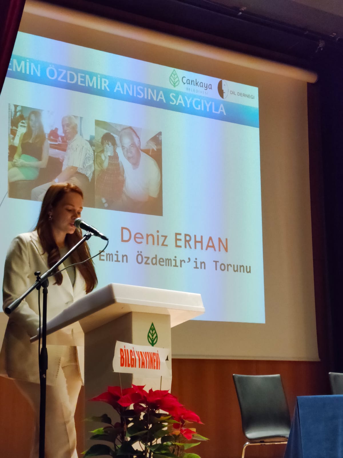 Emin Özdemir’in bir cumhuriyet öğretmeni olduğu, Dil Devriminin ışığında cumhuriyetçi çocuk ve gençlere Türkçeyi öğrettiği, yaşamının her aşamasında hem okuduğu hem de yazdığı vurgulandıktan sonra torunu Deniz Erhan dedesini, dedesiyle ilişkilerini anlattı.
