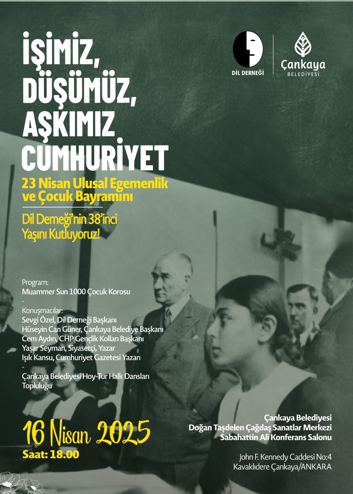 16 Nisan 2025 tarihinde, saat 18.00’de yapacağımız “İşimiz, Düşümüz, Aşkımız Cumhuriyet!” adlı etkinliğimizde, yaklaşan 23 Nisan Ulusal Egemenlik ve Çocuk Bayramıyla Dil Derneği'nin kuruluş yıldönümünü kutlayacağız. Çankaya Belediyesi ile birlikte yapacağımız etkinliğimiz, Çankaya Belediyesi Çağdaş Sanatlar Merkezinde.