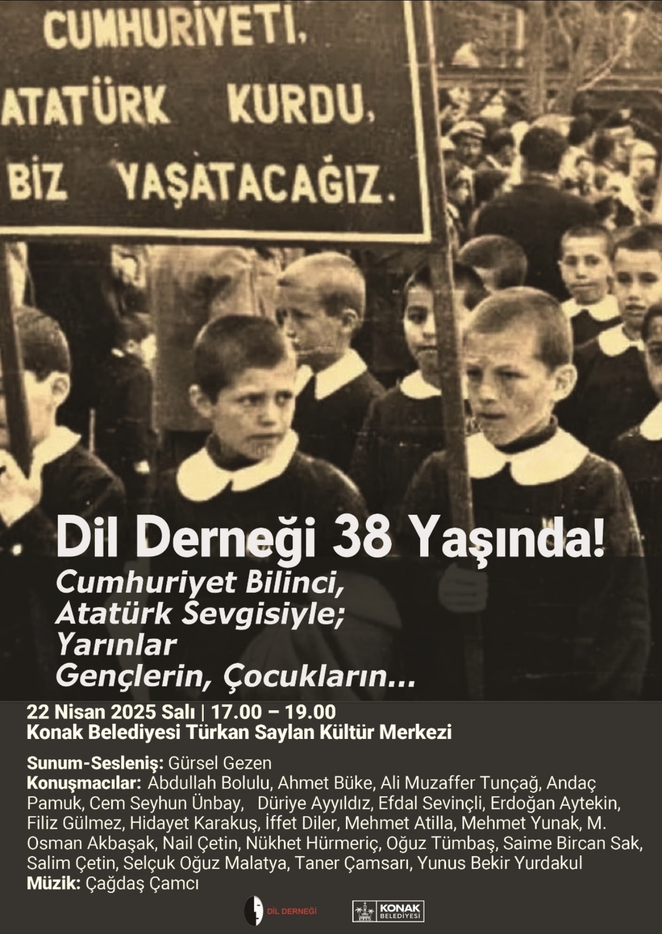 22 Nisan 2025 tarihinde, saat 17.00'de Konak Belediyesi Türkan Saylan Kültür Merkezi'nde İzmir Temsilciliğimiz tarafından bir etkinlik düzenlenecek: "Dil Derneği 38 Yaşında!"