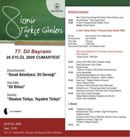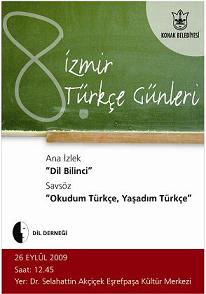 Dil Derneği İzmir Temsilciliği ile Konak Belediyesi'nin işbirliğiyle düzenlenen 8. İzmir Türkçe Günleri, 26 Eylül 2009'da gerçekleştirilen 77. Dil Bayramıyla başladı. 8. İzmir Türkçe Günleri'nin ana izleği "Dil Bilinci", savsözü ise "Okudum Türkçe, Yaşadım Türkçe". Bayramın ilk etkinliğinde Konak'taki Türkçe Taşı'nda Emek Ödülleri töreni yapıldı. |